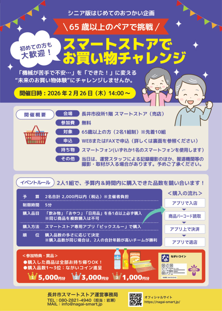 長井市役所内の「長井市役所スマートストア」にて、65歳以上のシニアを対象にした参加型イベント 「スマートストアでおつかいチャレンジ」 を開催します。